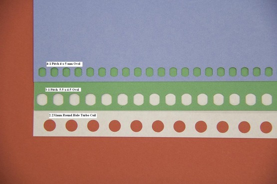 When working with 3:1 pitch plastic coil, it is recommended to use an oval punching die (6.5 mm x 5.5 mm). The key to this is using an oval hole die, trying to utilize a 3:1 pitch Wire-O round die doesn’t work well with these large books. When a thick book is being bound, the book will curve to follow the curve of the coil. As this happens, the punch hole “opening” is reduced. The expanded height of the 6.5 mm x 5.5 mm oval hole provides sufficient space to keep this “opening” as free and clear as possible, so that the coil can wind its way through the punch holes unobstructed.
