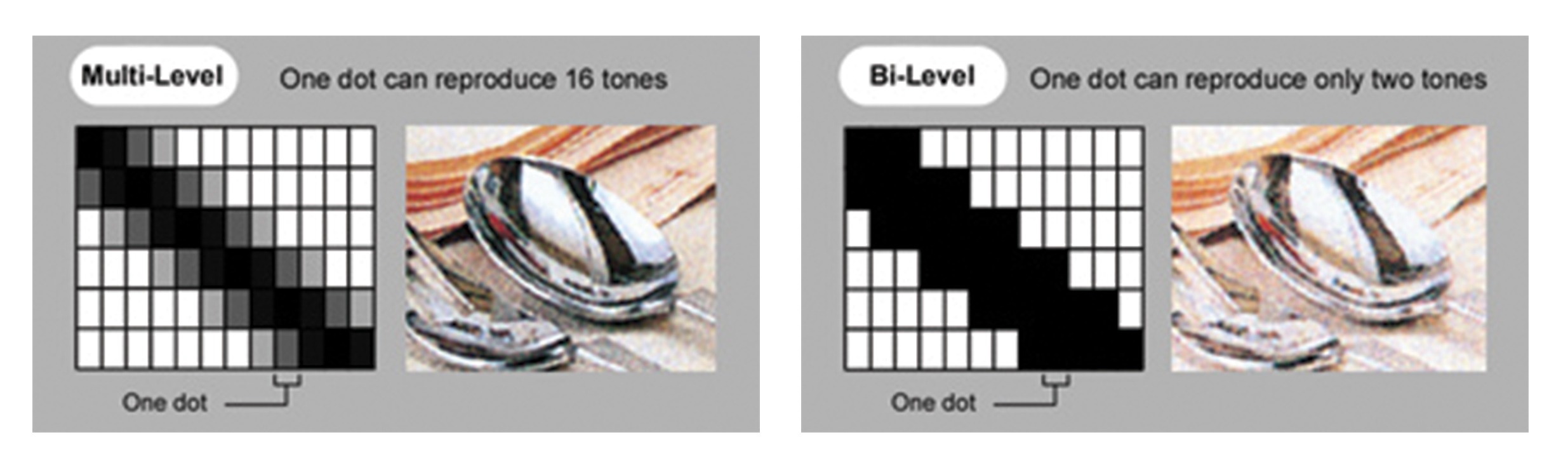 Traditional laser printers apply dots using two levels of intensity: 100% black or 100% white. Dots are grouped together (creating halftone cells) to simulate levels of grey. This is referred to as bi-level printing.By contrast, our multi-level LED printing technology can produce different levels of intensity. This produces up to 16 shades or tones in the range between black and white. This is similar to the effect you get when replacing a standard light switch with a dimmer switch.