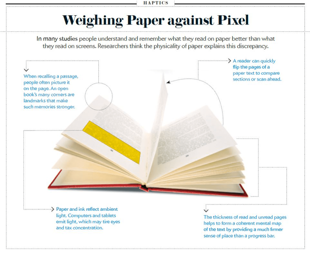 Check out the article for yourself. It goes into great detail about why the brain prefers paper and how the human brain interprets written language, perceives text and constructs a mental representation of the text that is similar to the mental maps we create of terrain and indoor spaces.