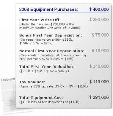 In summary, Section 179 allows businesses to deduct the full purchase price of qualifying equipment purchased or financed during the tax year. That means that if you buy (or lease) a piece of qualifying equipment, you can deduct the FULL PURCHASE PRICE from your gross income. This is essentially accelerated depreciation. Before the stimulus act, depreciation happened over 7 years. Each passing year you would deduct a fraction of the cost of your equipment from your gross income, thereby marginally reducing your taxes over time. Section 179 gives you all of that deduction from your gross income in one shot. The accelerated depreciation allowed by Section 179 of the 2008 Economic Stimulus Act can reduce the gross cost of equipment purchases by as much as 30%.