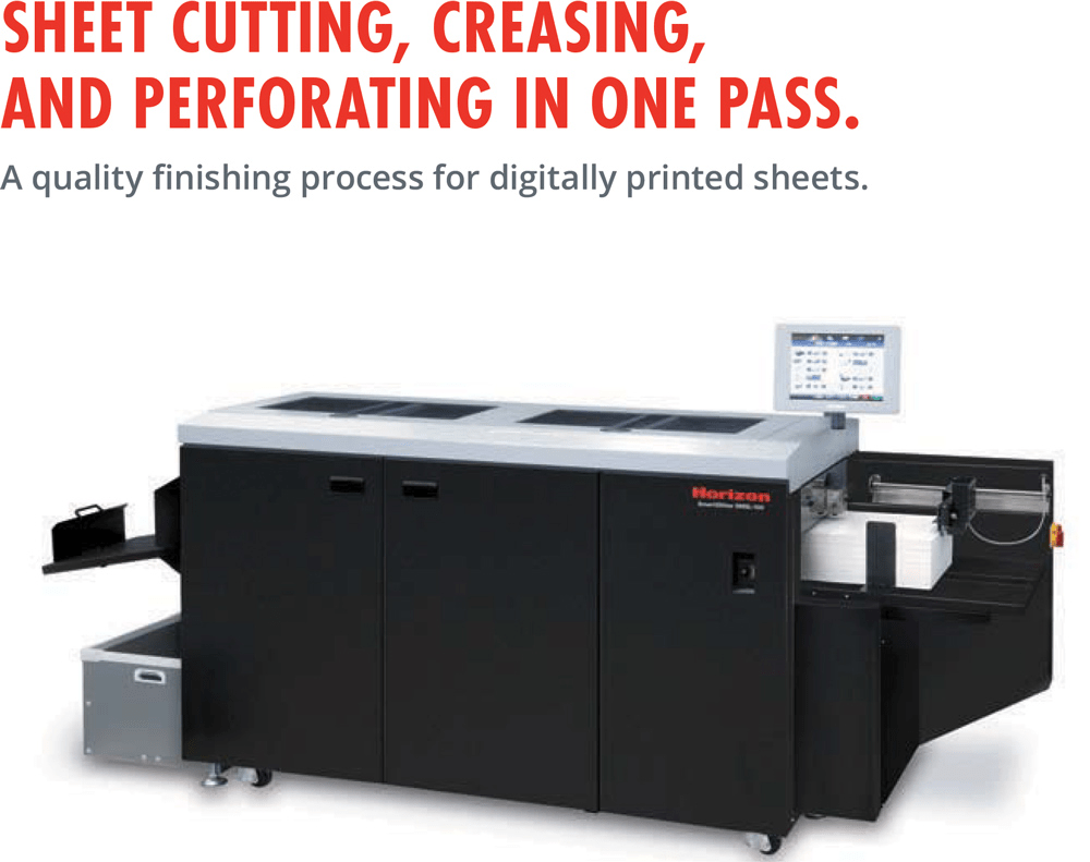 The Horizon SmartSlitter is a quality finishing process for digitally printed sheets that performs various finishing styles in a single pass including cutting, creasing and perforating.