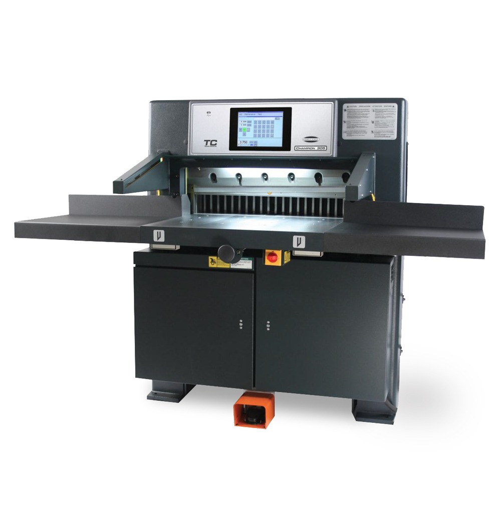 The NEW Champion 305 TC Paper Cutter is durable, accurate and easy to use programmable hydraulic powered paper cutter. With many new features and innovations improving efficiency, this work horse for cutting is still the only cutter available in this size range that ships from the factory CE, UL, and cUL safety standard certified and is in full compliance with the ANSI standard for paper guillotines and trimmers for North America.
